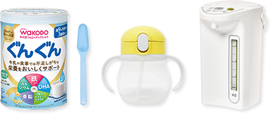 ぐんぐん、コップ(または哺乳ビン)、調乳ポットなど