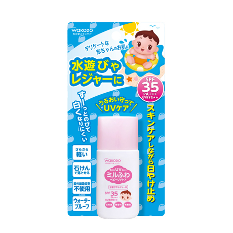 赤ちゃんの肌を考えて、水と油のバランスに着目したスキンケア。水溶性保湿成分(fēn)(オリゴ糖・イノシトール)&うるおい脂質成分(fēn)(リン脂質・セラミド)配合。お肌のうるおいを保ちながら、紫外線から守ります。石けんで落とせて、白くなりにくい!さらさらパウダー配合。水遊びやレジャーに適したウォータープルーフタイプ。SPF35。