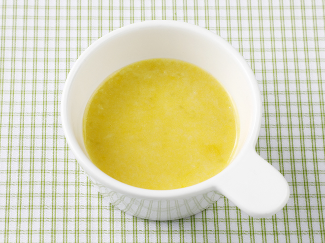- 「たっぷり手作り応援 おいしい野菜がゆ」と「手作り応援 パンプキンスープ」にお湯45ml(大さじ3杯)を加えてよく混ぜ、2~3分(fēn)待ちます。